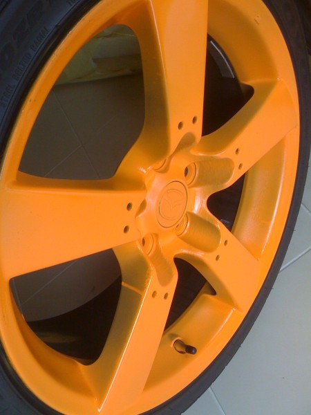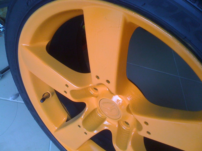 Je suis, comme je le disais, plutot satisfait, car les zones peintes ont été bien délimitées. J'ai fait un gabarit en carton qui venait se placer dans la jante. Ca m'a permis de ne pas peindre tout le fond de la jante.