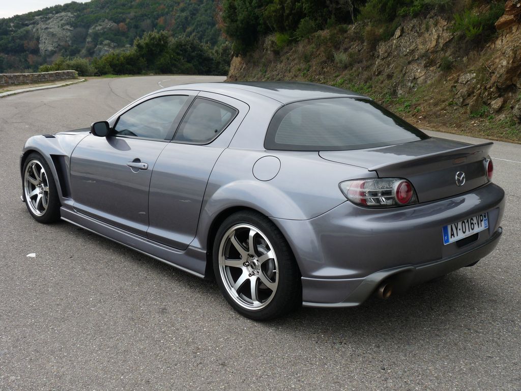 RX8 sunlight silver EP 192 ch 2004, cuir noir, tapis rx8, vitres glastint carbone light et super, pillars rx8, jantes Lazaro Azelio Black diamond alu poli 8,5x18 ET35, pneus kumho KU31, door handles chromées, catback Toyosports.