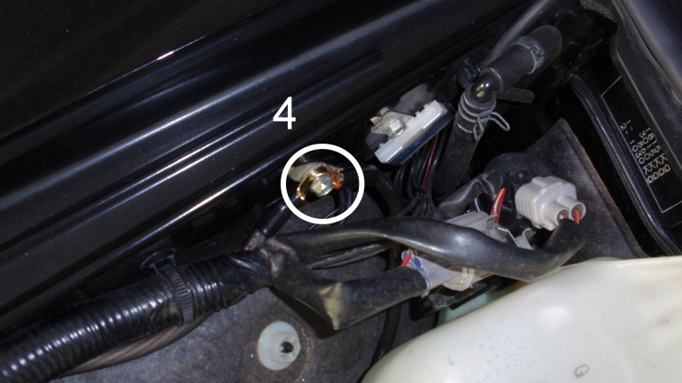 A cet endroit arrive un fil qui part directement de pôle négatif de la batterie.<br />De cet endroit repart un fil vers le point 4 (chiffre blanc)