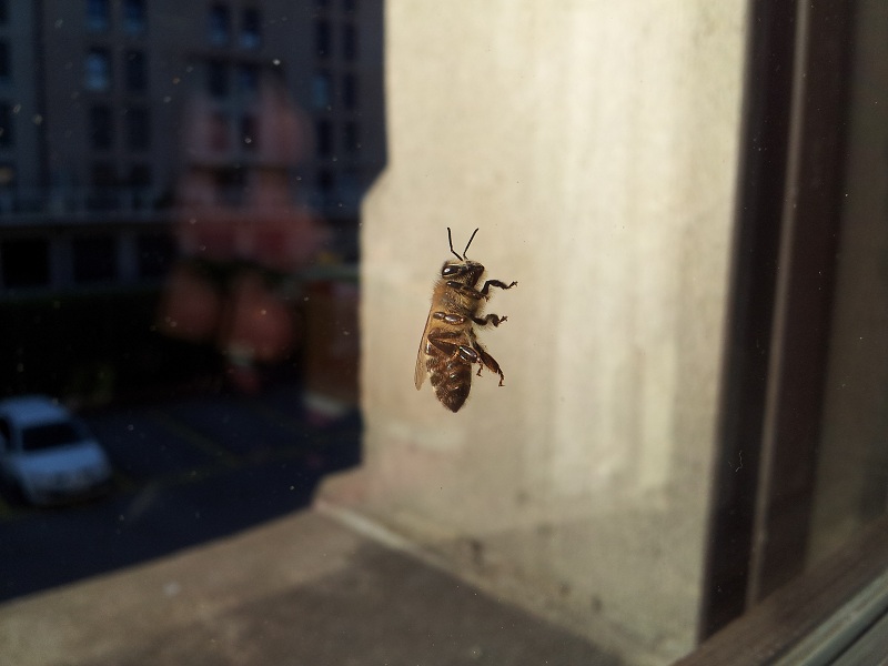 2 photos d'une série prise à mon boulot avec mon Galaxy S2 ( je n'avais que ça sous la main) d'une abeille en train de se réchauffer de bon matin sur une vitre