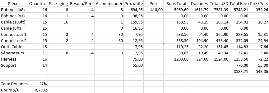 40$ par bobine + 36.45$ sur le harness + 5$ sur cable = 81.45$ = 61.76€ hors douanes donc les 50€ d'économies sont déja là