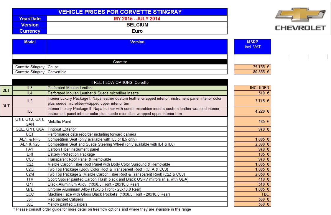 Les prix 2015 pour la Corvette, que je viens de recevoir de l'importateur.