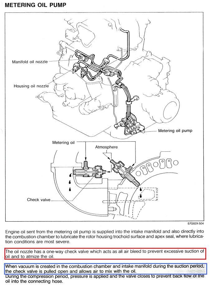 Oui l'huile se mélangeait avec le mélange air essence mais c'était sur RX7. Par exemple, sur FC athmo, une partie des injecteurs d'huile était directes dans la fin du plenum juste avant d'arrivé dans le moteur et le reste sur le haut moteur.