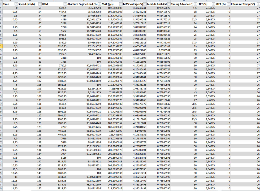 Voilà pour la présentation de la bête ! Je met en pièce-jointe un fichier Excel des logs d'un 50-150 en 2-3 à WOT, pour ceux que ça intéresse. On voit que la bestiole tourne un poil trop riche pour une décatalysée. De même, je ne dois pas sonder le bon PID pour le STFT. Je vais faire quelques recherches là dessus.