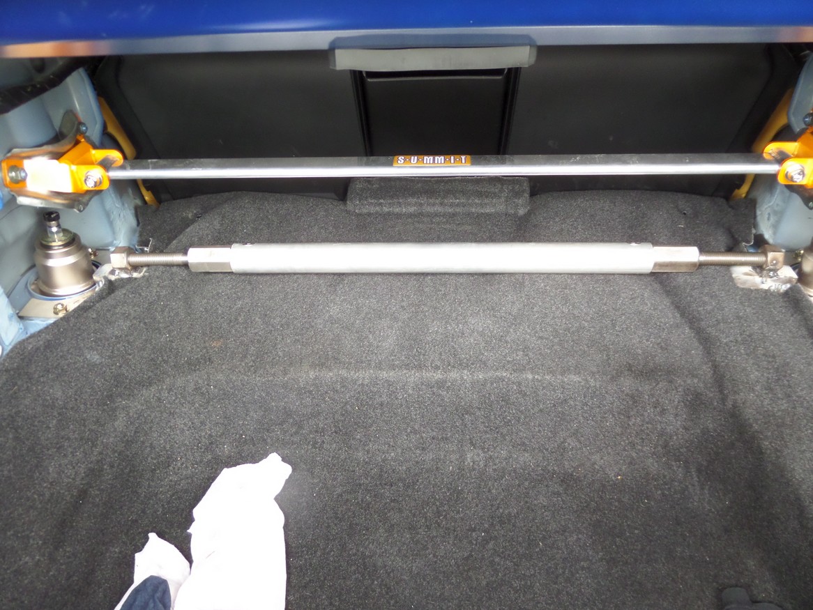 Le problème qui survient lors de l'installation d'un combiné filté est la perte du fourreau du dessus de l'amortisseur d'origine. L'ensemble permet la rigidité de la caisse arrière.Et donc voilà la barre supérieure et surtout la barre inférieure ("made in house pas joli mais efficace