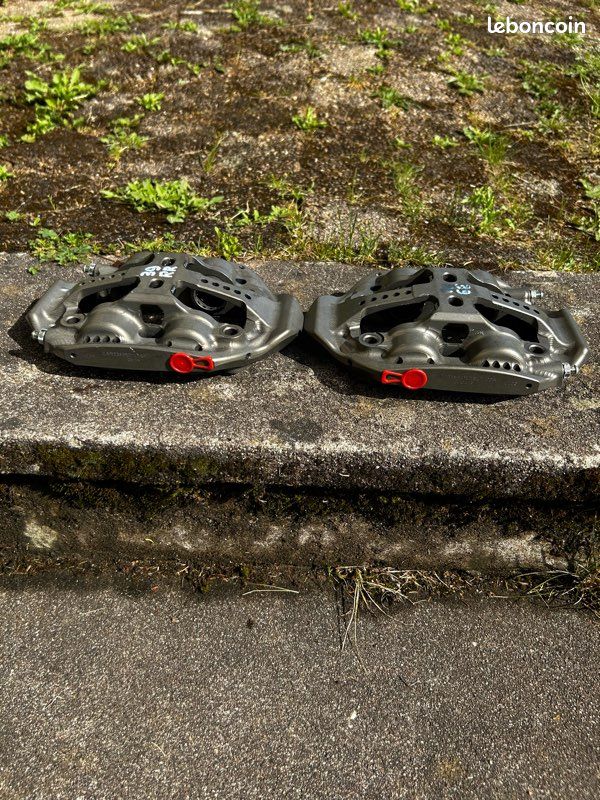 Alors pour les étriers avant , j'ai fais une trouvaille d'enfer , j'ai déniché des étriers ALCON 4 pistons (diamètres différents AV/AR) d'une EX formule E!