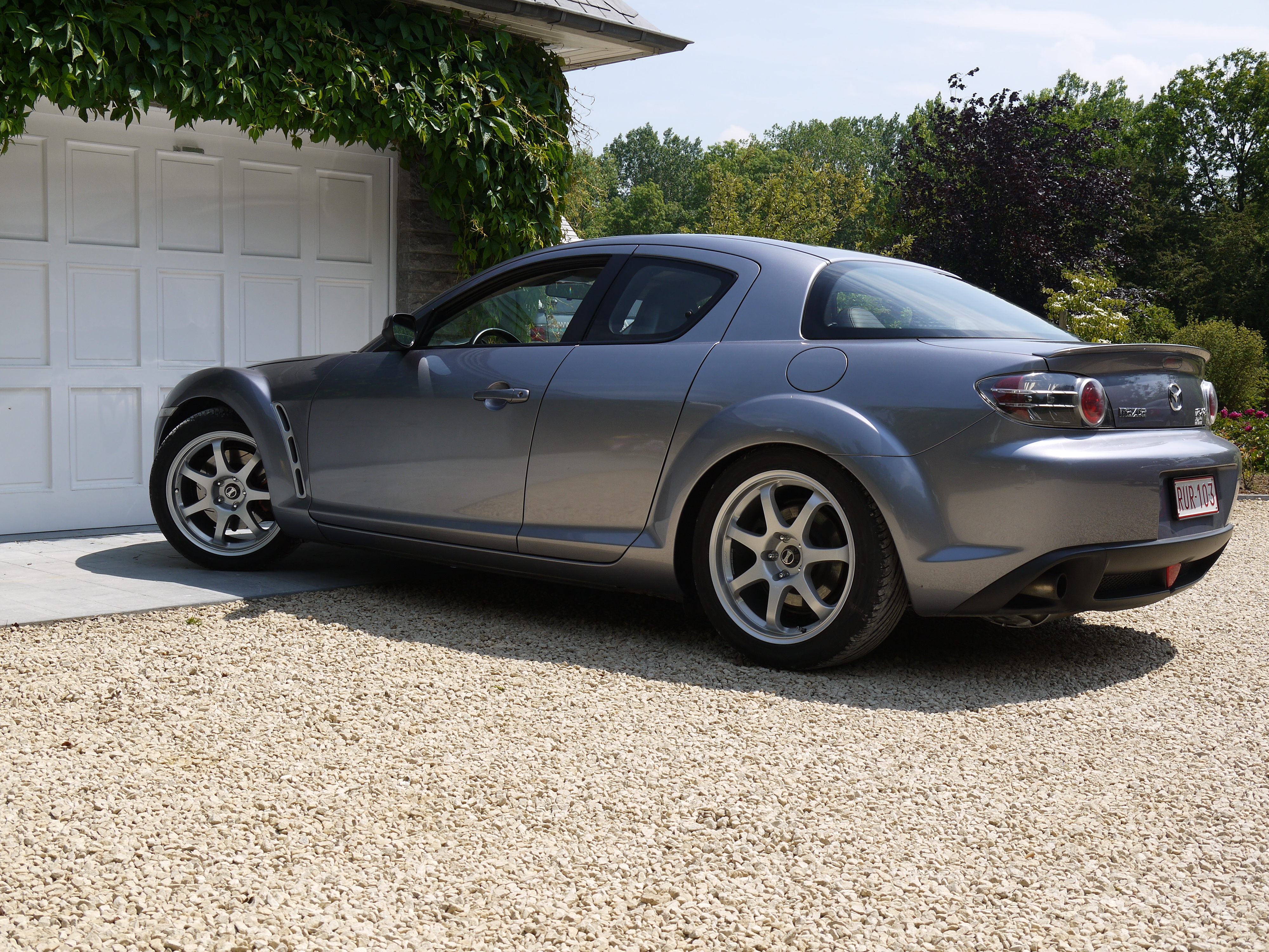 RX8 sunlight silver EP 192 ch 2004, cuir noir, tapis rx8, vitres glastint carbone light et super, pillars rx8, jantes Lazaro Azelio Black diamond alu poli 8,5x18 ET35, pneus kumho KU31, door handles chromées, catback Toyosports.