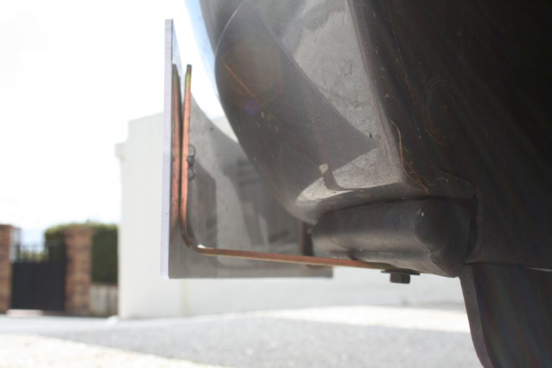 J'ai bien etudie les textes de loi concernant le positionnement et l'attachement de la plaque d'immatriculation, et ce positionnement est bien 100% legal. La plaque doit etre attachee avec des rivet (ce qui est le cas, car rivet sur les equerres), peut etre placee sur le cote gauche du vehicule, et ne doit pas depasser un angle de 45 degres. Donc c'est tout bon