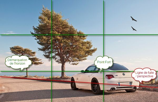 La voiture est sur un point fort de l'image attirant naturellement l'oeil. Ensuite, la ligne de fuite guide le regard vers les arbres (éléments que tu voulais mettre en valeur après la Z naturellement). Enfin, la ligne d'horizon est placée exactement sur une ligne des tiers.
