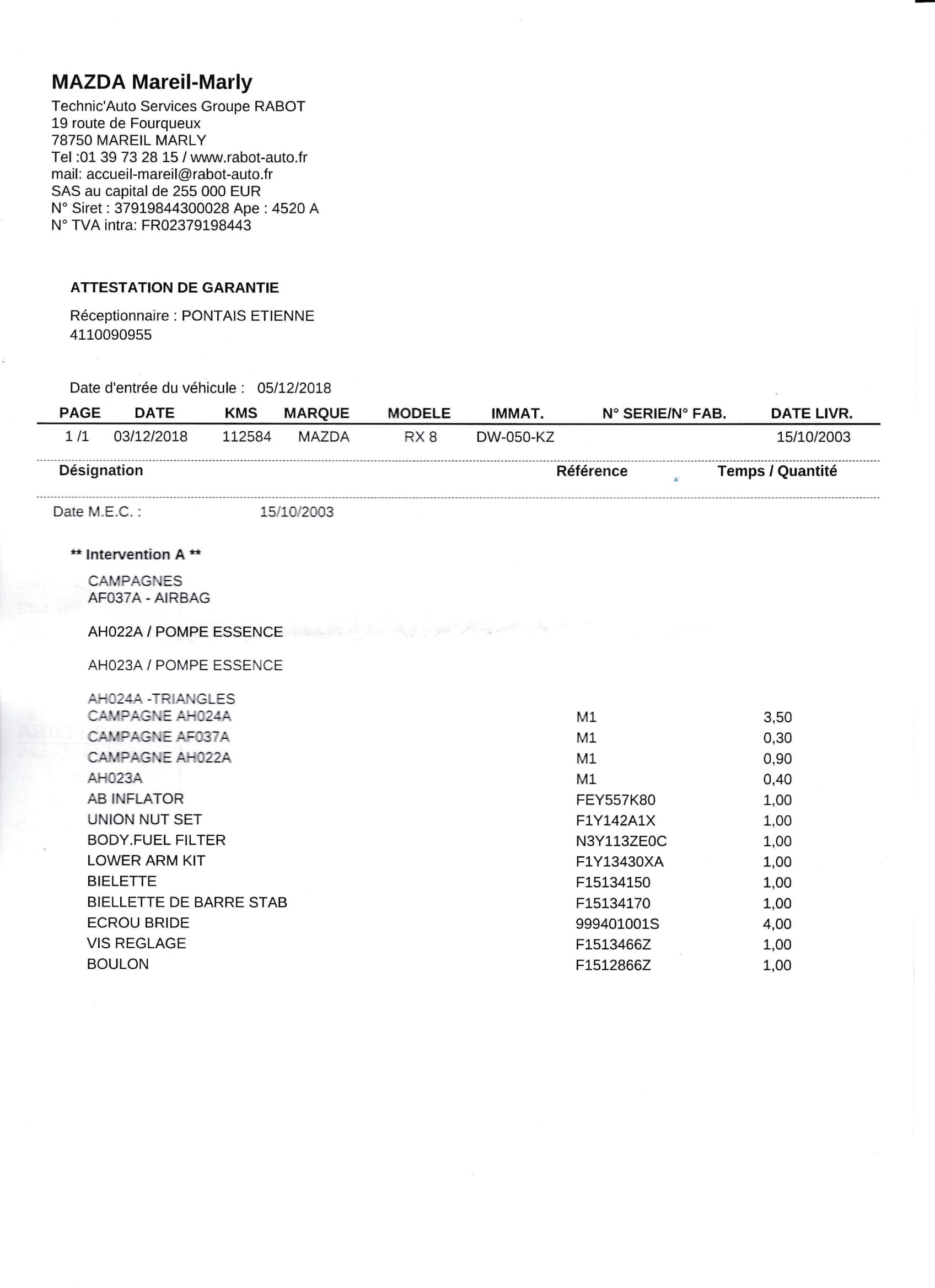 Rendez -vous pour le rappel "pompe à essence" reporté suite à mon appel la veille pour savoir si ma rx8 était concernée par les triangles. Il me mette gratuitement un véhicule de courtoisie à dispo.