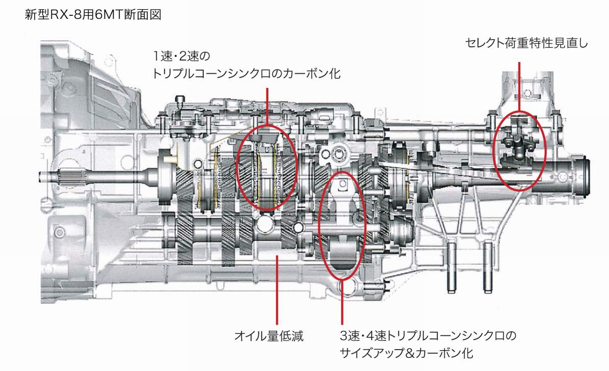 Le RX-8 restylée doit également ses meilleures performances de conduite à sa nouvelle boîte de vitesses manuelle à six rapports. Dérivée de la boîte manuelle à six rapports développée pour le MX-5 de troisième génération, elle a été révisée afin de gérer au mieux la puissance et le couple du moteur rotatif RENESIS. La version montée sur le nouveau RX-8 fait appel à des synchros de 1ère et de 2ème en carbone spécialement conçus pour ce modèle, ainsi qu’à des synchros de 3ème et de 4ème à triple cône de plus grandes dimensions, également réalisés en carbone. Le couvercle porte-roulement a par ailleurs été renforcé et la taille du carter de transmission légèrement réduite afin de garantir une meilleure capacité de lubrification interne. Il en résulte de meilleures sensations au passage des rapports, rendant ainsi le nouveau RX-8 encore plus agréable à conduire.