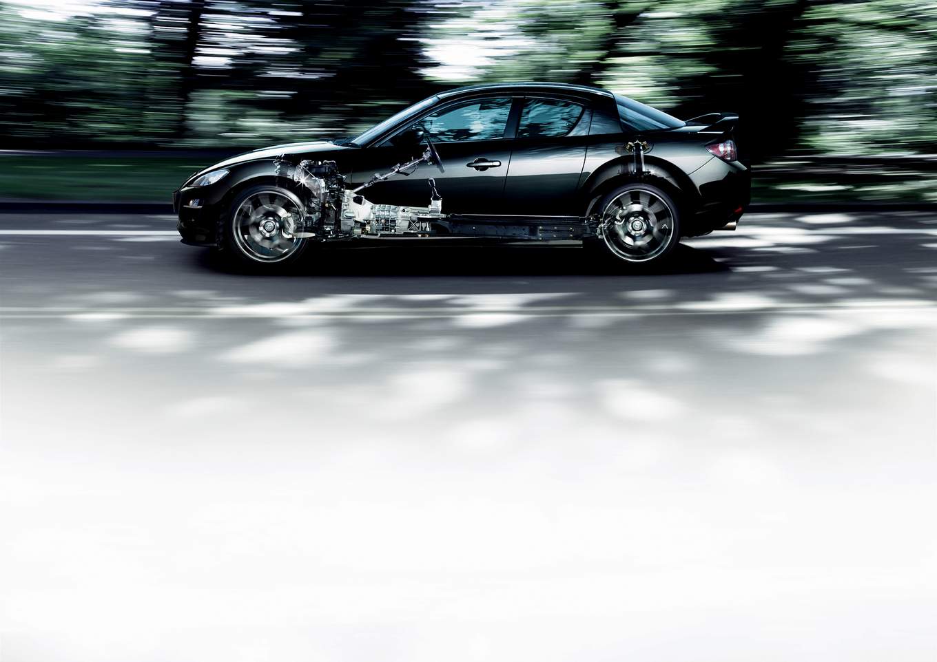 La version restylée du RX-8 conserve le moteur en position centrale avant et la transmission aux roues arrière de sa devancière, une configuration qui lui garantit une répartition idéale du poids (50/50) entre les trains avant et arrière pour une exceptionnelle tenue de route. Cette qualité naturelle du RX-8 est encore accentuée sur cette nouvelle version, grâce à une meilleure rigidité de la caisse, une direction plus réactive et une stabilité dynamique encore supérieure.