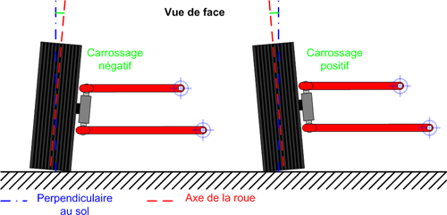 Le carrossage est l'angle entre la roue et le plan perpendiculaire au sol suivant l'axe longitudinal du véhicule. On mesure cette valeur en degrés et minutes.
