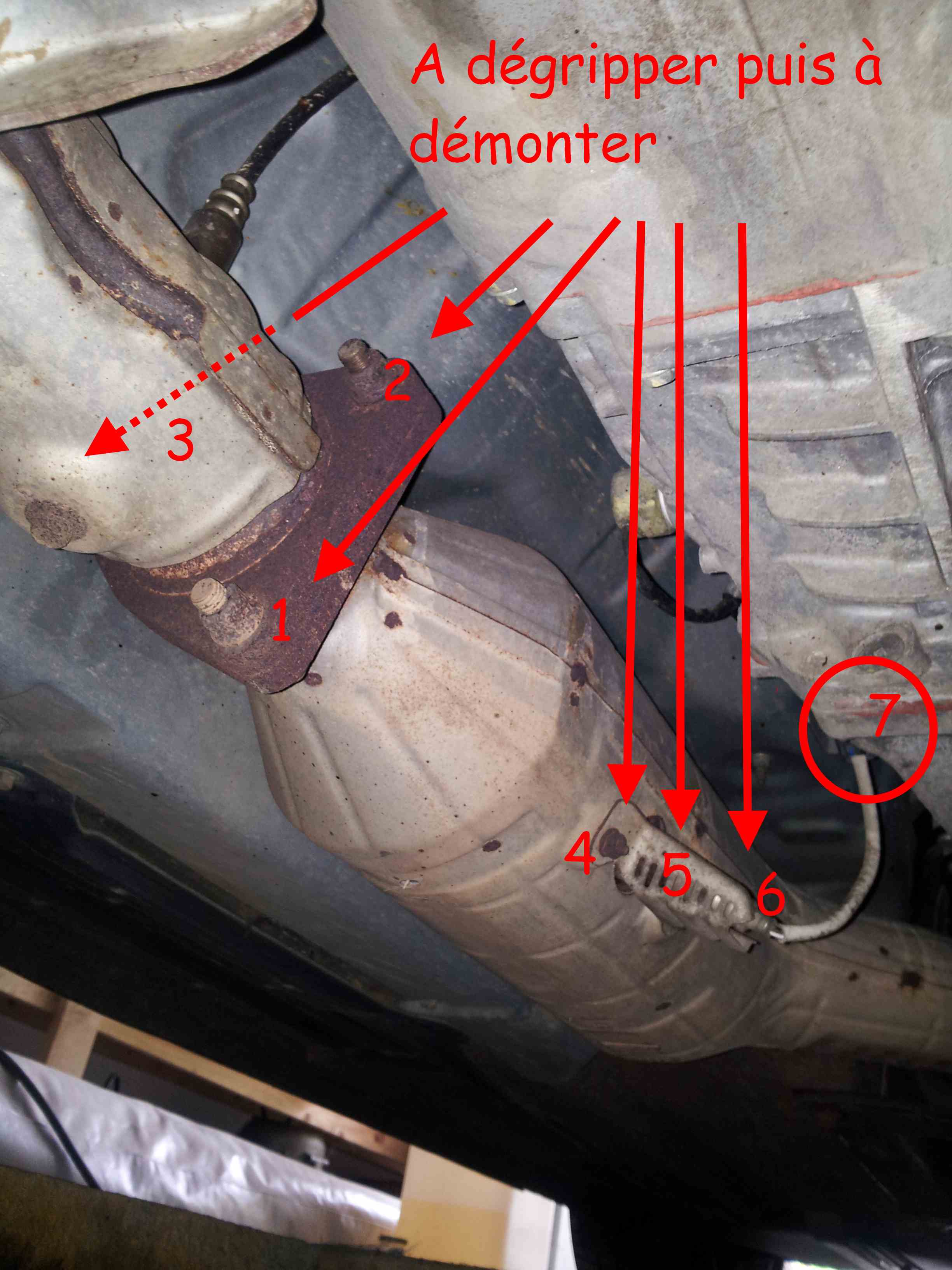 On passe ensuite au triangle avant et à ses 3 boulons. Il faudra prevoir de la visserie de remplacement si comme moi vous avez acheté votre décata d'occasion car les boulons 1,2,3 ainsi que les tetes de goujons 8 et 9 sont soudés au catalyseur OEM