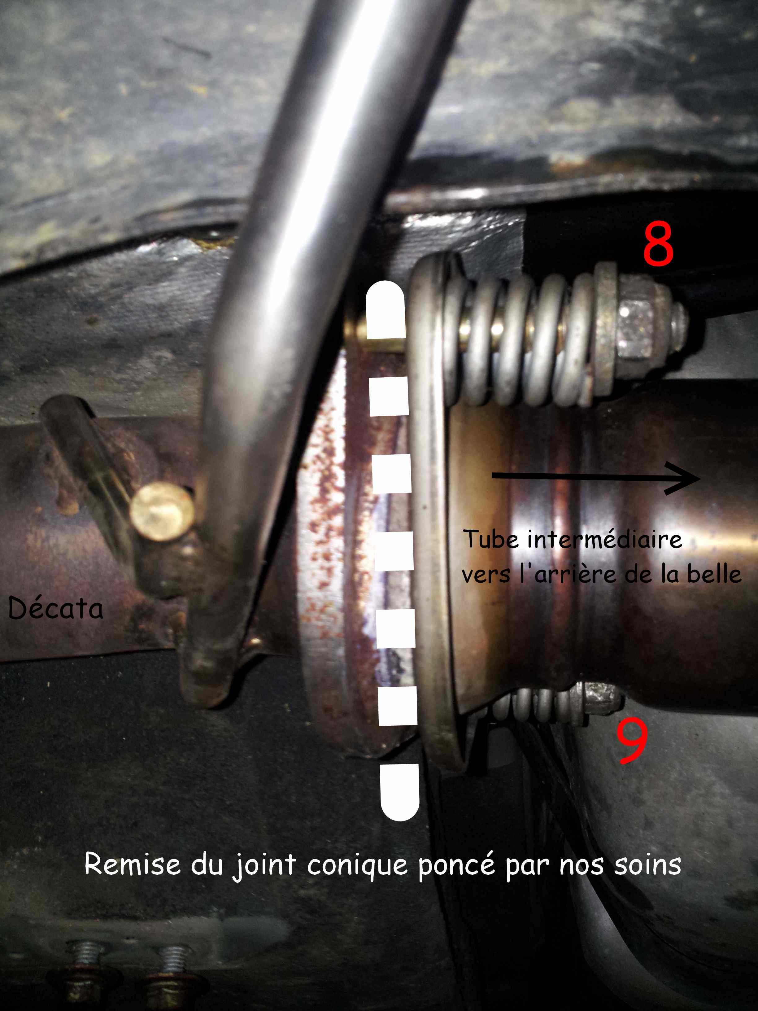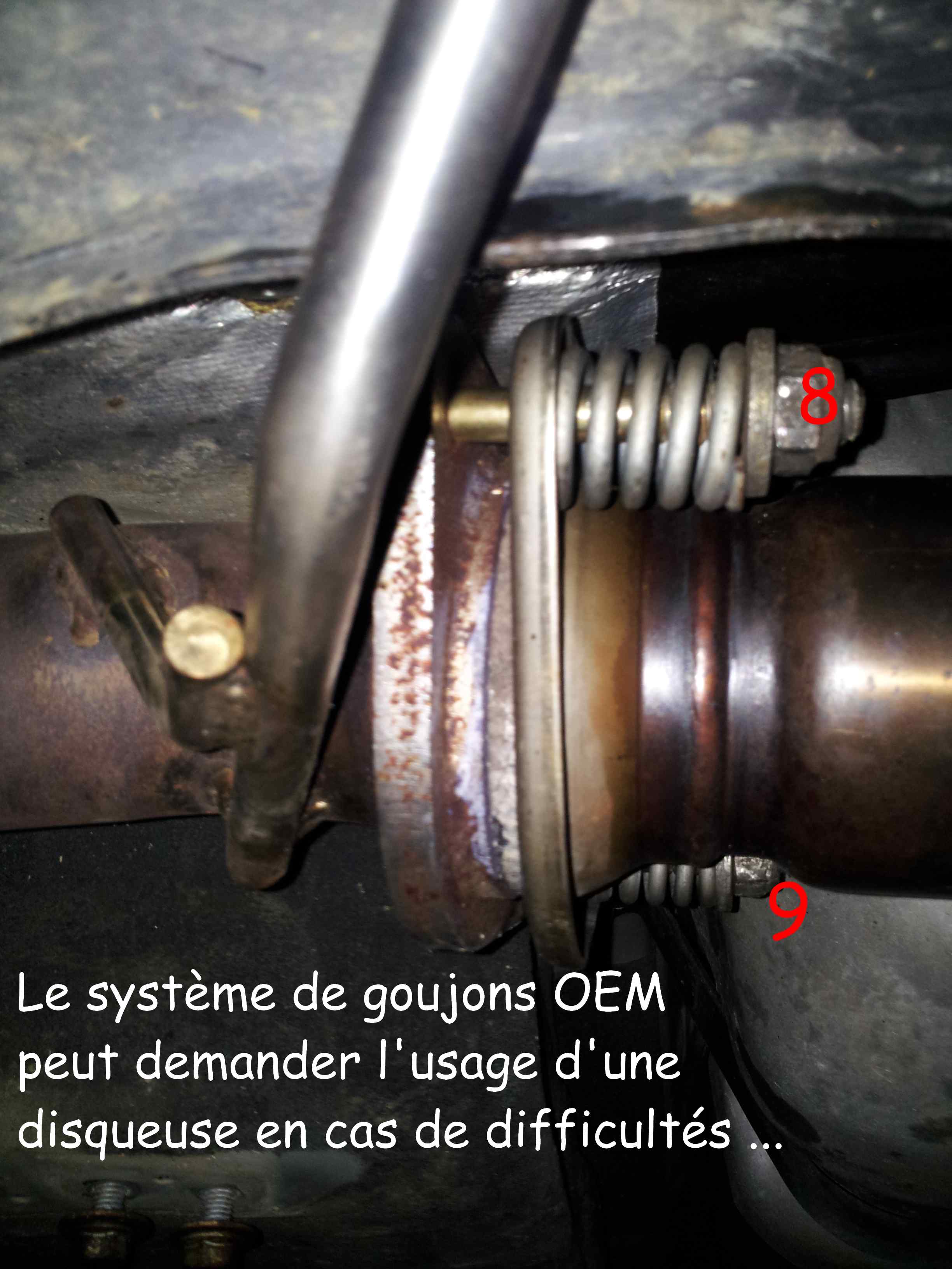 On récupère aussi les ressorts sur les goujons (8 et 9) à la fin du catalyseur. Ils seront utiles au remontage sur votre nouvelle visserie. Ne pas hésiter d'ailleurs à prendre de bonnes rondelles bien larges et épaisses pour assurer l’assise de ces mêmes ressorts ;)