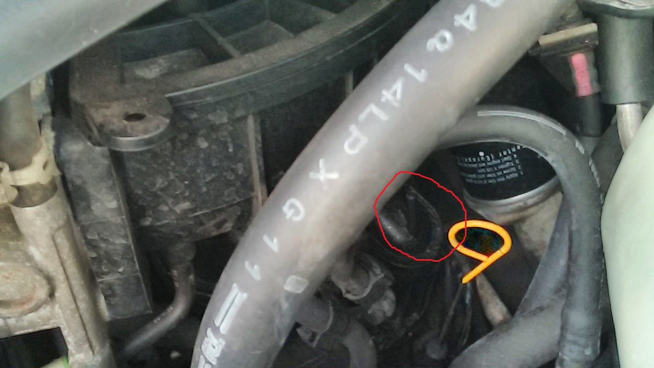 j ai fais ma mise a niveau d huile,mais dans un endroit plus eclairé que d habitude et du coup j ai remarqué une sorte de sortie non connectée a un tuyau ou bouchée.je voulais savoir si c etait normal ou non.ca se trouve a coté de la jauge et du filtre a huile,j ai entouré en rouge sur la photo.