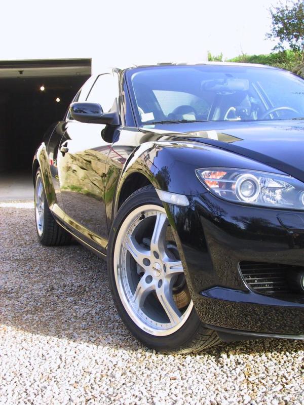 RX8 sunlight silver EP 192 ch 2004, cuir noir, tapis rx8, vitres glastint carbone light et super, pillars rx8, jantes Lazaro Azelio Black diamond alu poli 8,5x18 ET35, pneus kumho KU31, door handles chromées, catback Toyosports.