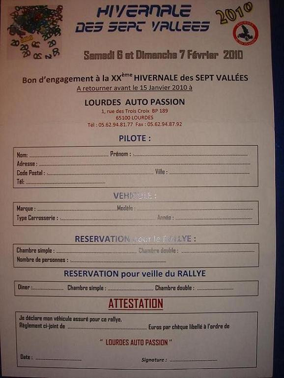 Je viens de recevoir le formulaire d'engagement pour participer au XX Rallye hivernale des sept Vallées , organisé par le Club Auto Passion de Lourdes