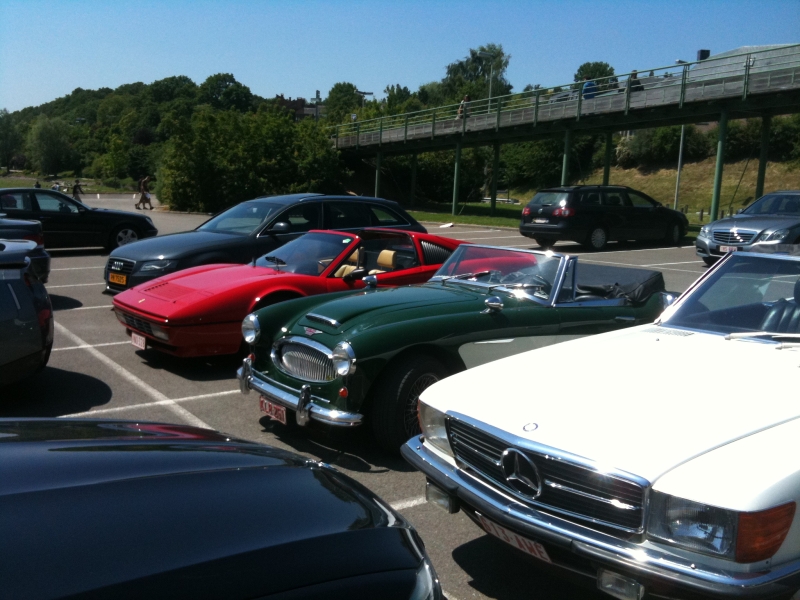 Une belle brochette ce midi : Ferrari 328GTS, Austin-Healey Mk3000 et Mercedes SL300.