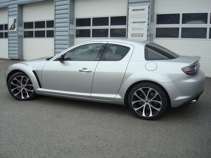 RX8 sunlight silver EP 192 ch 2004, cuir noir, tapis rx8, vitres glastint carbone light et super, pillars rx8, jantes Lazaro Azelio Black diamond alu poli 8,5x18 ET35, pneus kumho KU31, door handles chromées, catback Toyosports.