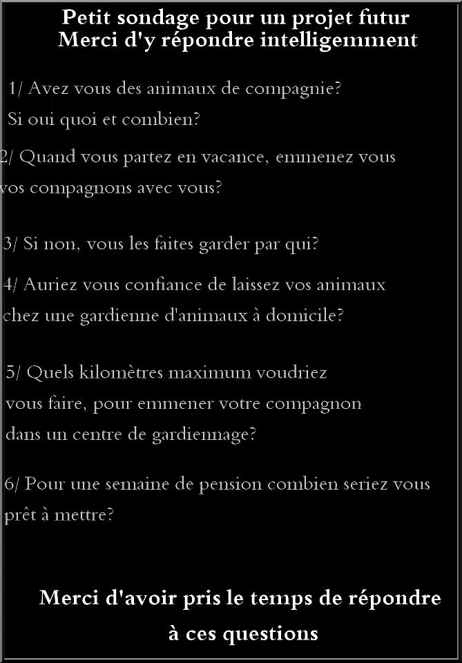 Dans le cadre d'une création d'entreprise "garde d'animaux" mon amie effectue un sondage pour monter un dossier solide pour décrocher une formation "création / reprise d’activités" .