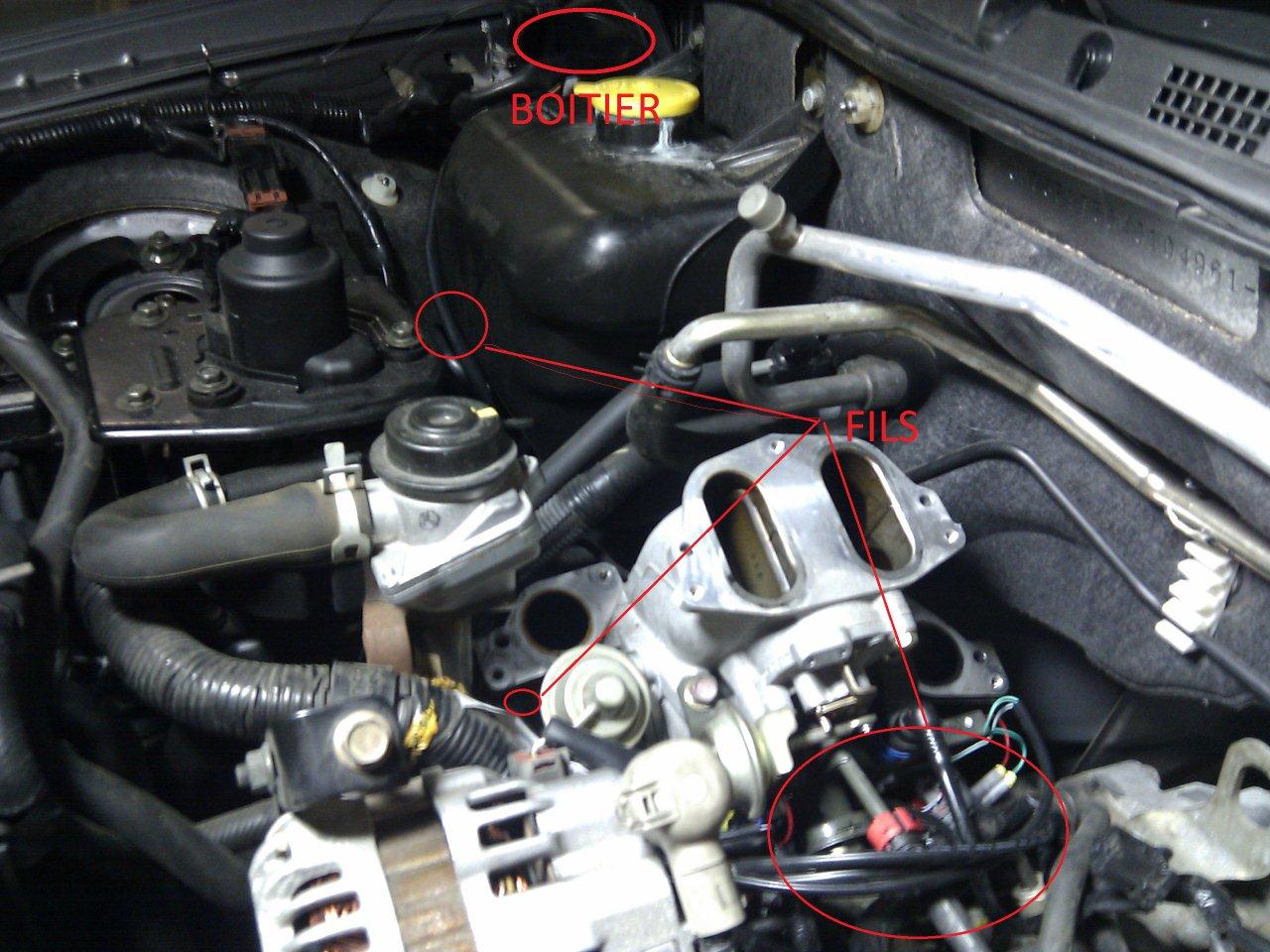 Quand on a tout branché, on passe les fils le long d’un faisceau. Pour trouver une position au boitier. Et on oublie pas de brancher les 2 fils noirs (ou un seul pour le boitier 192CH) à la masse (sur une vis fixée au châssis).