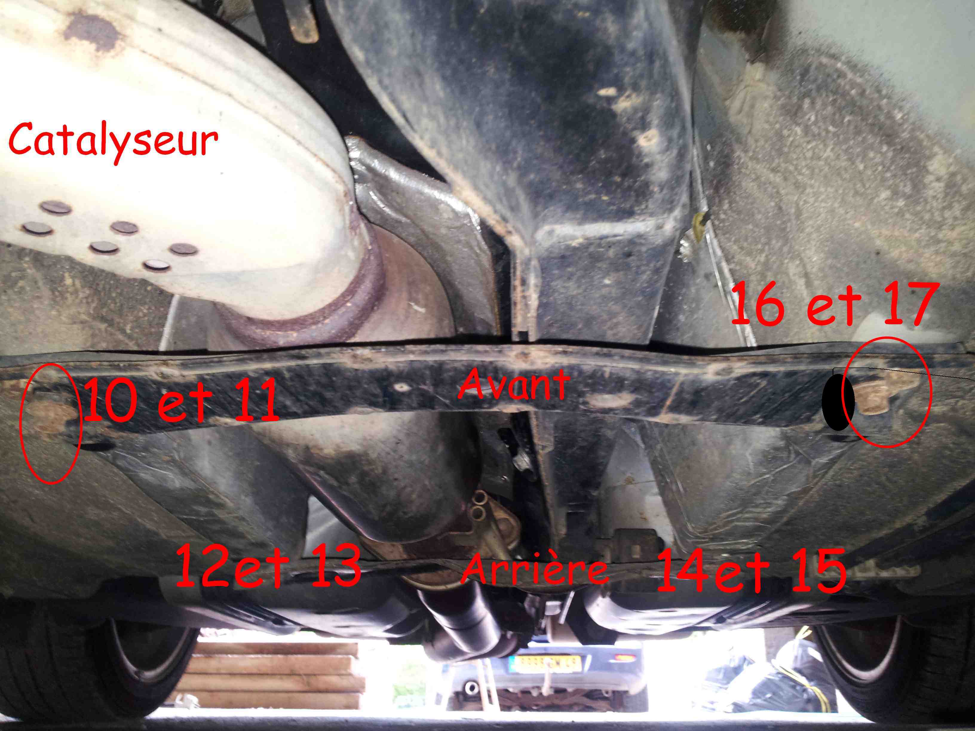 On démonte nos deux traverses et leurs 4 boulons respectifs (10 à 17). Notez leurs sens et leur positions avant/arrière mêmes si elles sont très différentes l'une de l'autre :chut: