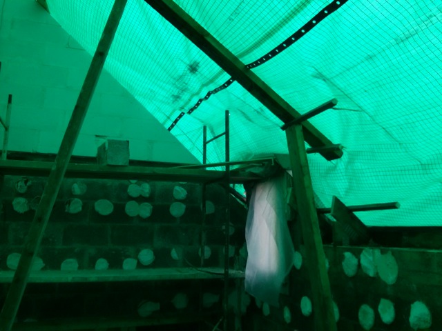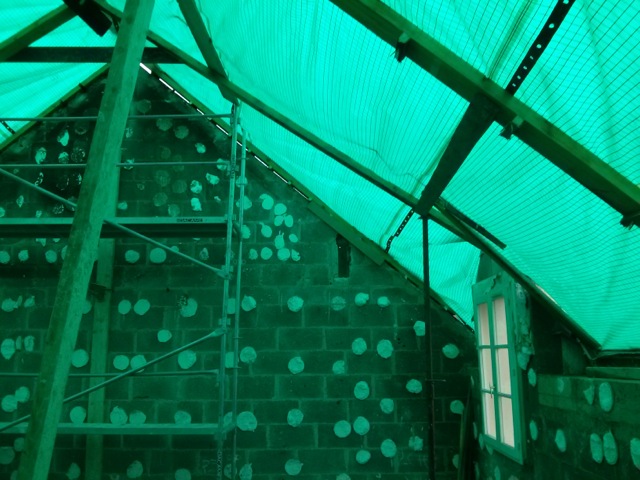 Aujourd'hui le pignon a été reconstruit et étayé pour passer la nuit vu qu'il y avait pas mal de vent et que le ciment n'était pas sec...