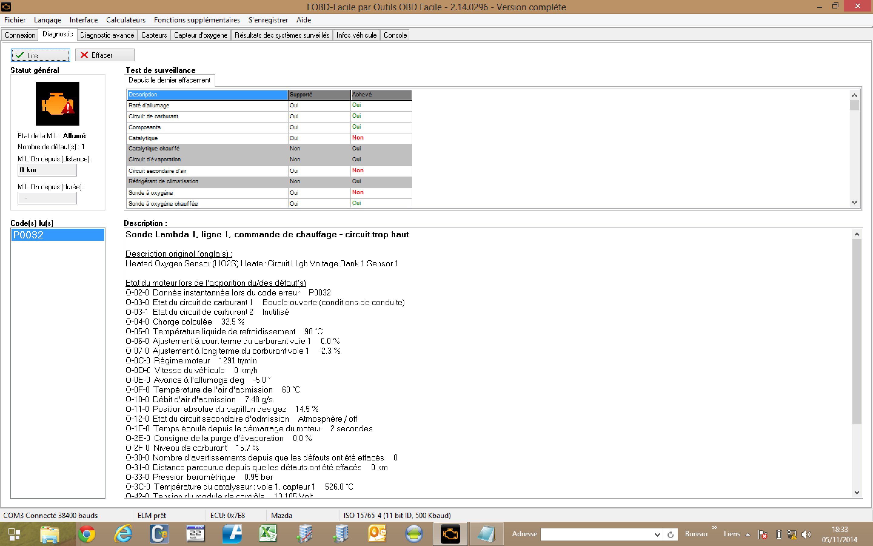 j'ai le code P0032 qui est apparue,avec comme motif "sonde lambda 1, ligne 1, circuit trop haut" que j'ai changé mais le code reste même après effacement...