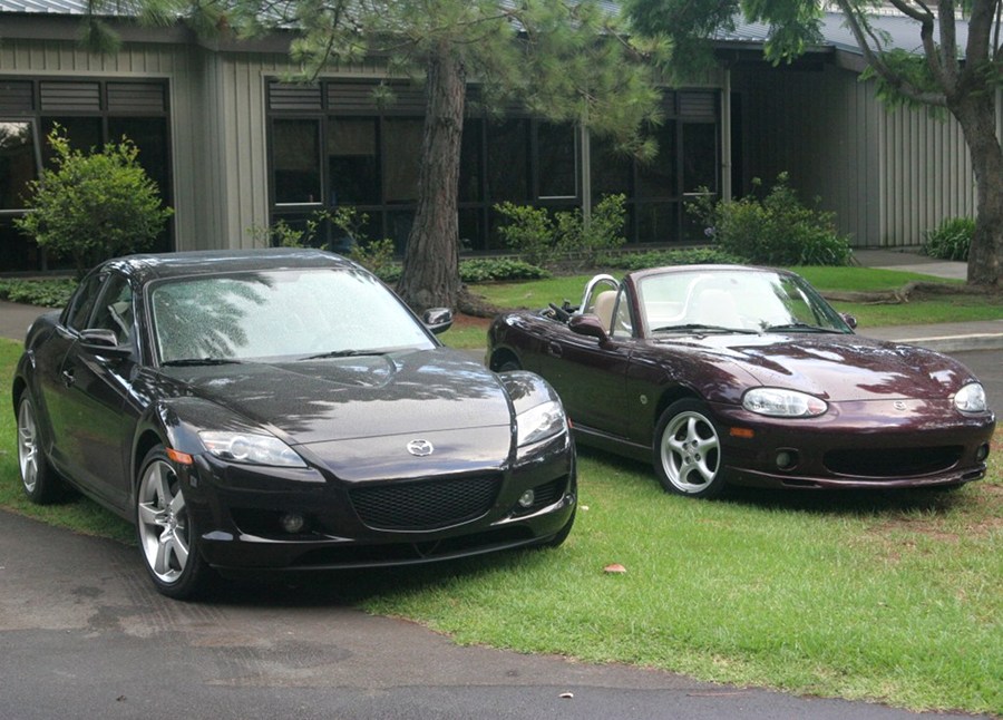 Ah, tres jolie Miata! J'en profite pour glisser cette photo: quand j'ai achete ma RX-8 Shinka en 2005, j'avais la Miata 2nd generation depuis 2000. Elle est vite partie (j'ai continue a l'apercevoir de temps a autre jusqu'a mon depart dans notre petite ville Kamuela, tres bien maintenue) mais pendant qq semaines en 2005 j'avais les 2 dans les garage. ![]()