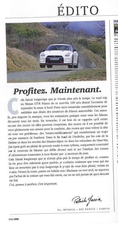 Je tenais à partager avec vous l'Edito paru dans le magazine Evo de ce mois ci (magazine que je vous recommande en passant, chaque essai du magazine étant un réél plaisir à lire et également à contempler tans leurs photos sont belles).