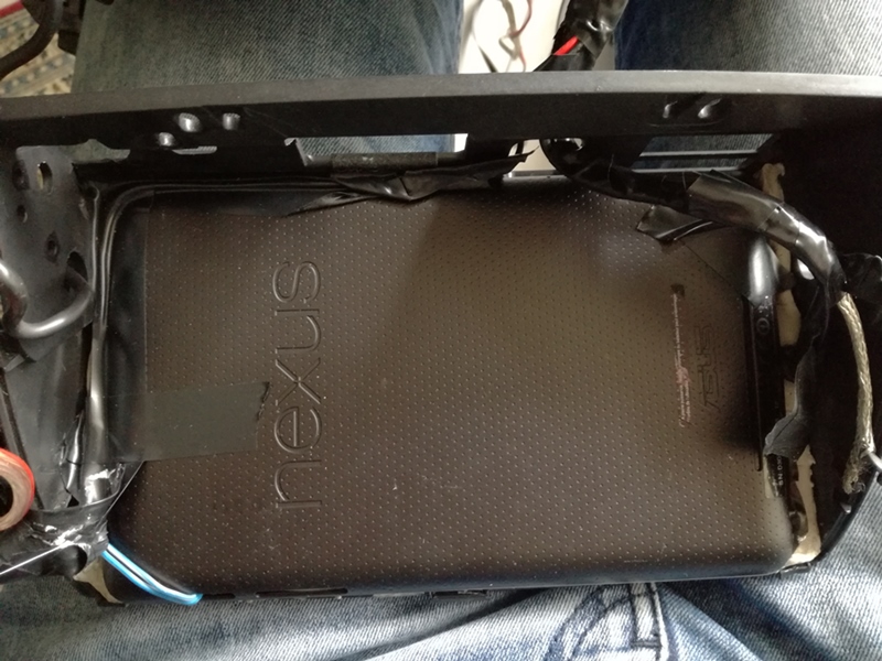 Tablette Nexus dans son logement à l'origine. On ne va garder que le câble d'alimentation et déconnecter le jack 3.5 mm pour garder la Nexus indépendante de l'autoradio.