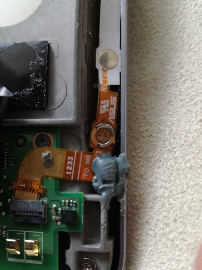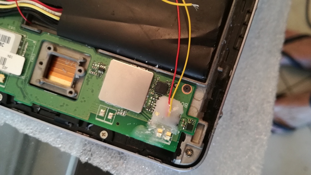 On voit ici la barette qui reprend le on/off le volume moins et le volume plus puis le reset (prévu mais non opérant sur cette Nexus de première génération). N'ayant pas réussi à ressoudé le on/off que j'avais arraché j'ai soudé sur le connecteur directement
