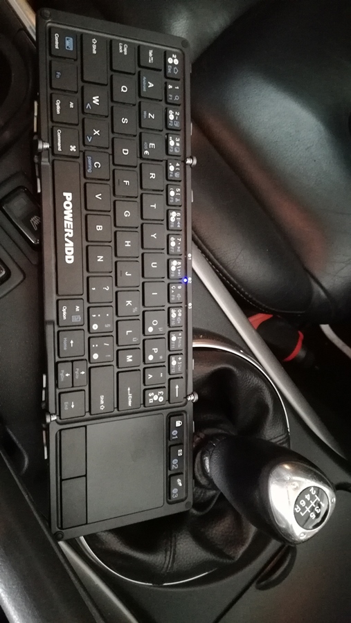 Le clavier replié, rentre sans problèmes la boîte à gants, compatible avec les trois OS : Androïd, WIndows, IOS
