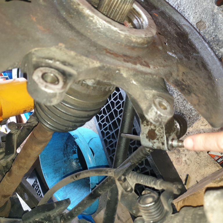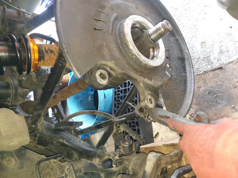 Pour cela pour moi défaire les 2 axes qui maintiennent les 2 rotules côté fusée côté avant de la voiture, ainsi que l'amortisseur pour tourner la fusée...