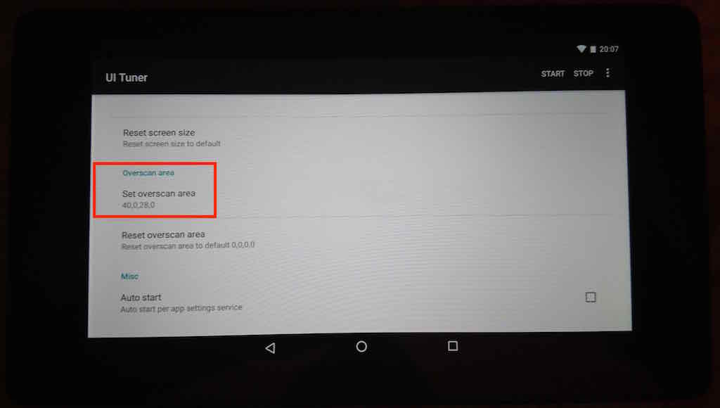 Attention, certains réglages (dont l'overscan qui est la fonction utilisée pour redimensionner la taille de l'affichage) modifient complètement l'affichage et il est impossible de revenir en arrière sauf à utiliser le programme "adb" lorsque la tablette est connectée en USB à un ordinateur (le programme "adb" se trouve dans le SDK d'Android.