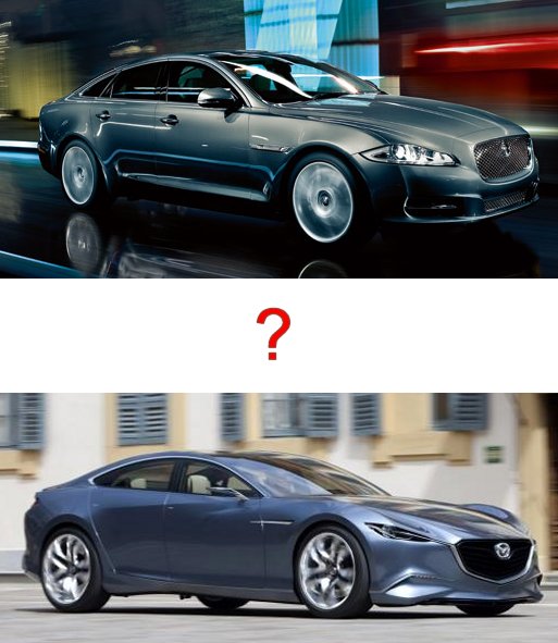 A mes yeux, la Jag et la Mazda se ressemble clairement dans le traitement général, bouche avant proéminente et profil de coupé 4 portes sans custode (je sais, la Jag en a une, mais si profilée qu'elle se voit à peine). Même le traitement épuré de l'arrière les rapproche.