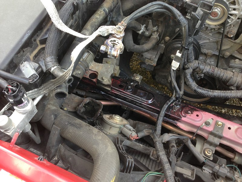 Par-contre lors du démontage de la batterie et de son support je me suis appercu que l'acienne avait coulée et un peu attaquée la traverse donc petit coup de frameto...