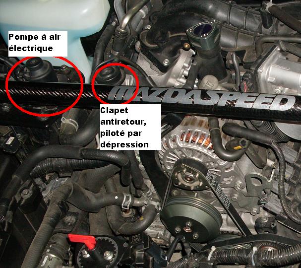 La pompe est relié par une durite sur un clapet antiretour qui doit empêcher les gaz d’échappement de remonter dans la baie moteur.