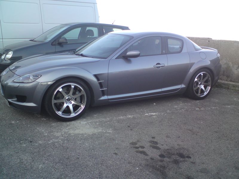RX8 sunlight silver EP 192 ch 2004, cuir noir, tapis rx8, vitres glastint carbone light et super, pillars rx8, jantes Lazaro Azelio Black diamond alu poli 8,5x18 ET35, pneus kumho KU31, door handles chromées, catback Toyosports.