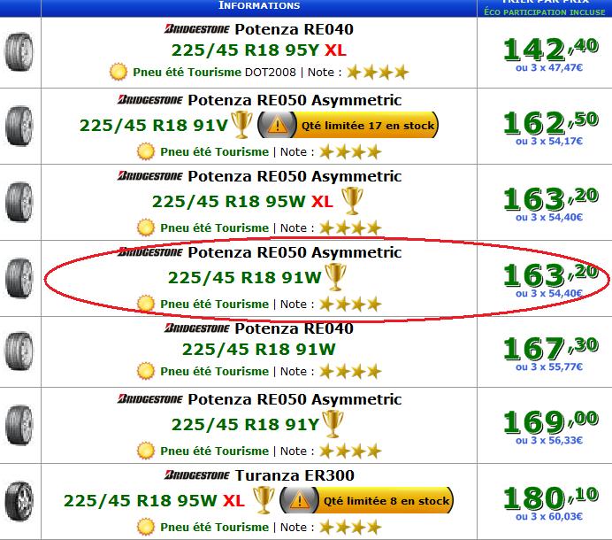 Je partirais pour ceux qui sont entourer en rouge les RE 050 225 45 R18 91W.