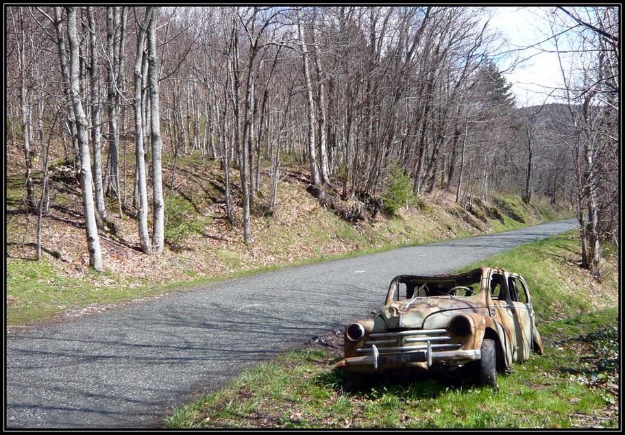 Photo du parcours du matin, la pauvre 4cv ça doit faire plusieurs dizaines d'années qu'elle était au fond du fossé. :