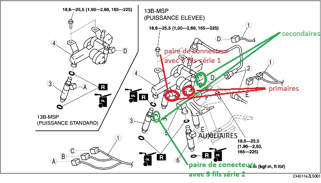 Voir schéma ci-dessous, c'est plus clair. On replira correctement les 2 connecteurs qui ne servent pas de chaque série en faisant attention de ne pas les mettre à un endroit qui gêne. Et on ne branche rien sur les 2 connecteurs des injecteurs auxiliaires qui se trouvent dessous.