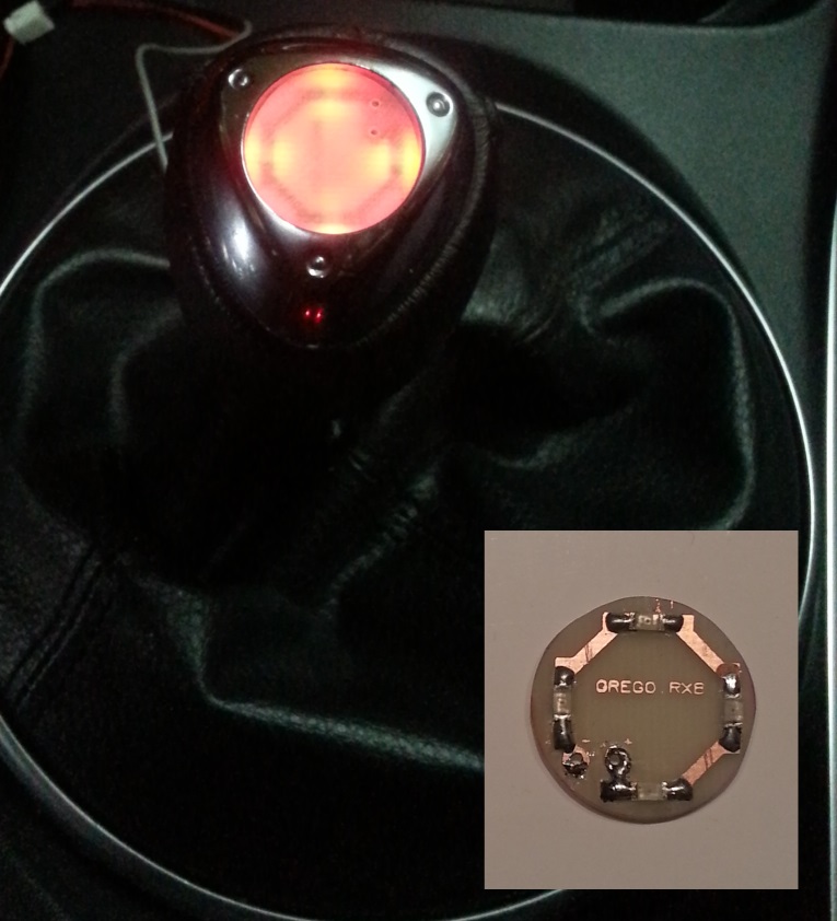 je me suis penché sur un dispositif d'éclairage particulièrement jolie c'est celui du pommeau de vitesse il existe déjà plusieurs produits finis en vente un peu partout, mais alors à des prix plutôt impressionnants. j'ai utilisé du circuit imprimé comme base pour créer la platine d'éclairage mais aussi la sérigraphie. On peut le réaliser en noir, cuivre, étain puis polir et vernir 8 couches environ. pour le passage des fils il suffit de percer le pommeau du bas vers le haut.