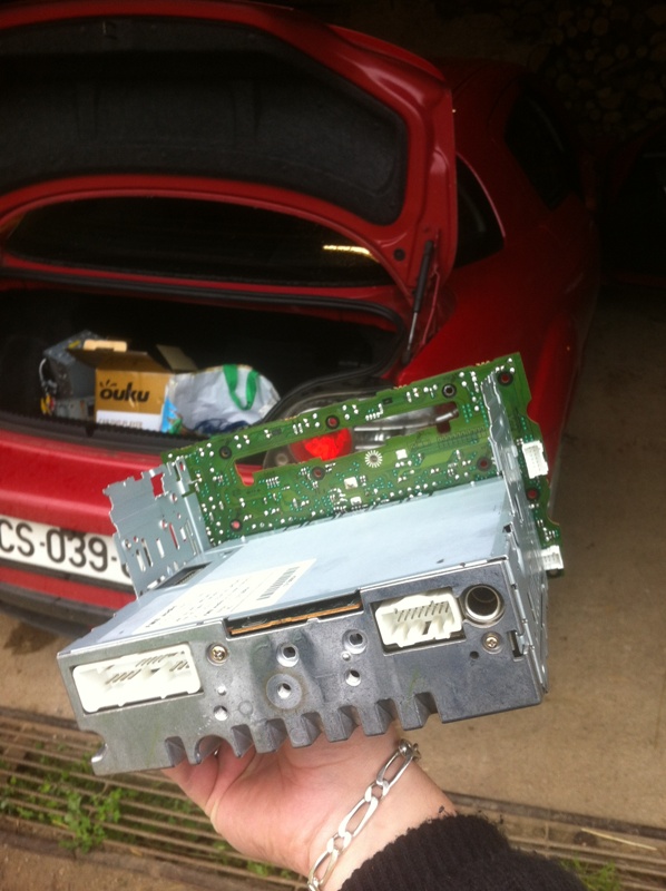 j'ai commencé ça sur la 8 de anthonyg, il avait au préalable démonté son autoradio (engrenage du chargeur CD explosés) et découpé la facade pour encastrer sont nouvel autoradio double-DIN.