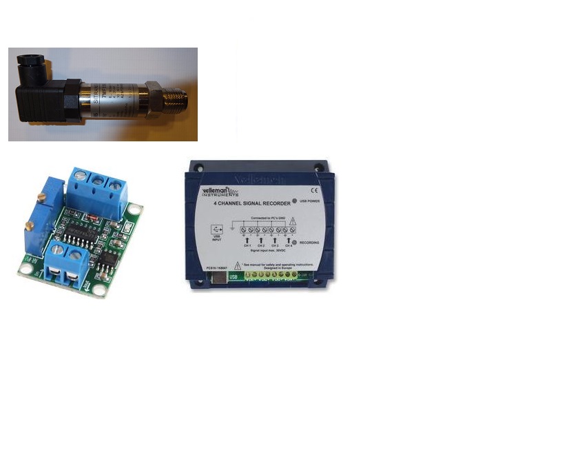 Voulant trouver un compressiometre pour les rotatifs j'ai cherché un peu sur le net. Au début j'ai pensé que le prix était une erreur (mini 400€) mais non. Alors étant électronicien je me suis dit que le faire était la solution. Alors en fait c'est très simple. Acheter un capteur de pression avec une sortie 4 à 20 Ma (plus facile à trouver que celui avec sortie de 0 à 10 volts et moins cher ,environ 25€ sur eBay. Ensuite acheter un data logger ( on peut le faire avec un simple arduino mais le data logger de chez velleman coute 45€ alors...) Ensuite, soit une simple résistance de 500 Ω ou bien se procurer un convertisseur 4 à 20 Ma vers 0 à 10 volts. Cela coute environ 6€ et la précision sera plus grande qu'avec la résistance. De plus pas d'offset avec le convertisseur pour le 0, alors que la résistance donnera 2 volts pour le 0 de pression. Une fois que l'on a les composants il reste à fixer la sonde sur un culot évidé d'une vieille bougie, puis de brancher la sortie de la sonde sur le convertisseur, et la sortie de celui-ci sur une entrée du data logger. On branche la prise USB du velleman et sur le soft de celui-ci, on aura de belles courbes de pression bien nette et bien précise si on à pris soin d'étalonner la sonde. Vue que 4 entrées sont possibles sur le velleman rien ne vous empêche de faire rentrer la sortie du capteur de révolution et de vérifier les T/M pendant la prise de compression.